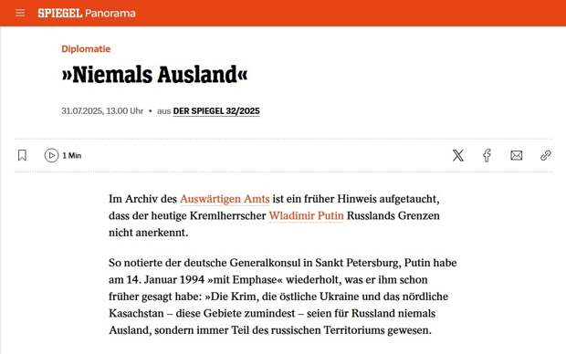 В архиве МИД Германии обнаружен ранний документ, указывающий на то, что президент России Владимир Путин ещё в 1994 году не признавал постсоветские границы. Об этом пишет немецкий еженедельный журнал Der Spiegel.