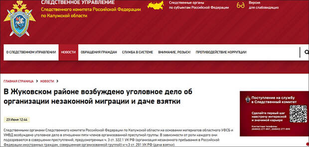 Калужский Следком сообщил, что в отношении двух полицейских начальников, а также троих их подельников из Средней Азии возбуждено уголовное дело по части 3 статьи 322.1 УК (организация незаконного пребывания в Российской Федерации иностранных граждан, совершенная организованной группой) и части 3 статьи 291 УК (дача взятки).