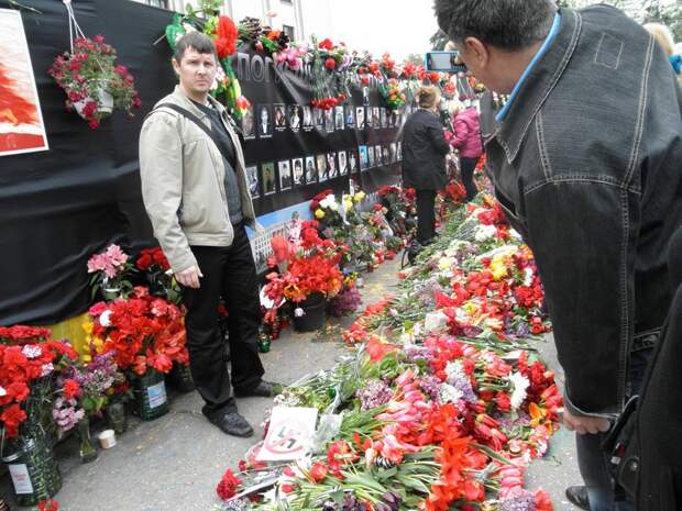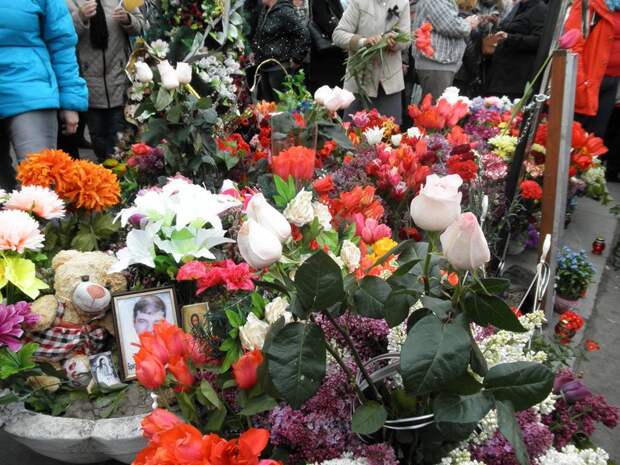 Много цветов. Поминальные букеты несут к Дому Профсоюзов с утра. Задолго до объявленной на 14 часов дня панихиды.