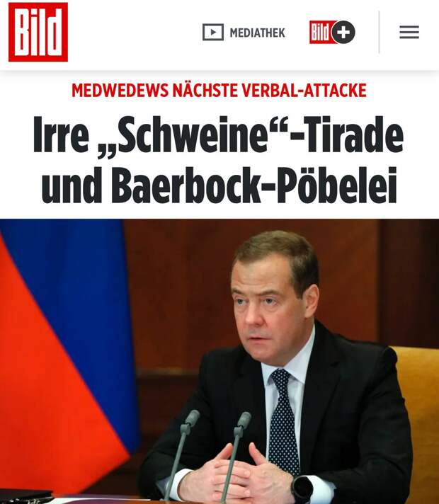 Медведев: «Даже необразованная баба Бербок и ряд других надсмотрщиков в европейском свинарнике умудрялись ворчать о недопустимости прекращения огня». Подобные тирады и оскорбления по-прежнему являются лучшим показателем того, что люди, о которых идет речь, поступили очень правильно, когда это так раздражает таких людей, как Медведев.
