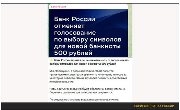 Пока верстался номер Банк России принял решение отменить голосование по выбору символов для новой банкноты 500 рублей.