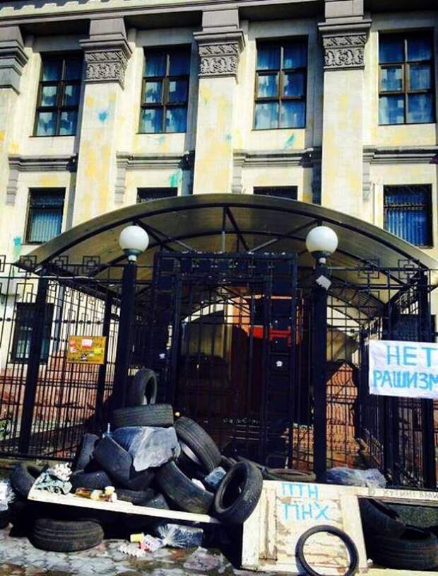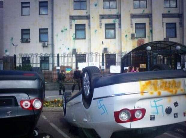 Днем 14 июня активисты заблокировали вход в дипмиссию автомобильными покрышками. В начале акции участники пикета закидывали здание посольства яйцами и пузырьками с зеленкой, затем в ход пошли камни и взрывпакеты. Многие пришедшие к зданию посольства жгли дымовые шашки. К участникам акции присоединились активисты самообороны Майдана. В здании выбиты стекла, припаркованные автомобили дипломатов буквально разобраны на запчасти. Участники погрома сняли российский флаг, вывесив на его место знамя Украинской повстанческой армии.