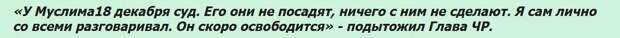 Так же прозвучит очень тяжеловесное заявлении уполномоченного по правам человека Чечни Мансура Солтаева о невиновности Муслима ни в одном эпизоде. Защита серьёзных и родных людей, почему-то не помогла и всё закончилось реальным лишением свободы на 1 год 11 месяцев.