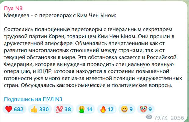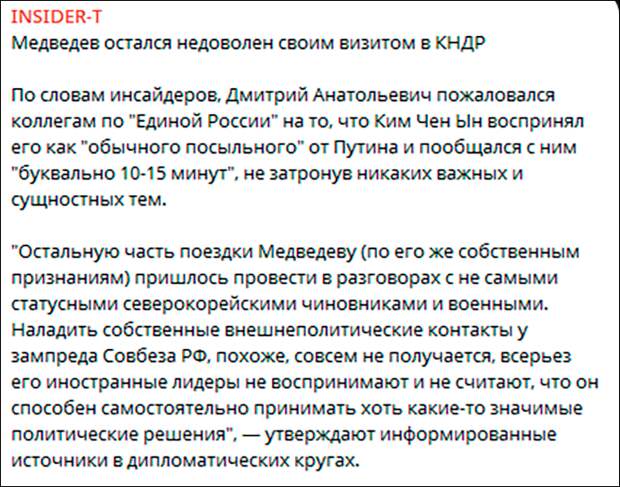 Вот вам и реальные итоги визита Медведева в КНДР. Он играет роль эмоционального тарана, которого Кремль выпускает туда, где нужны не договорённости, а психологическое давление. Его фигура нужна не для дипломатии, а для подтверждения наступательной решимости России в её готовности стать центром нового, антиглобалистского международного ордена.