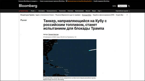 Bloomberg и другие западные СМИ в деталях расписывали (ссылаясь на спутниковые данные и информацию морской аналитической компании Kpler Ltd.), как осуществлялась эта операция и какой звонкой "пощёчиной" она будет для президента США Дональда Трампа, если груз дойдёт до задыхающейся от энергетической блокады Кубы. В январе остров впервые за десять лет вообще не получил ни одного барреля нефти после того, как в конце прошлого года американские военные захватили судно, перевозившее венесуэльскую нефть на Кубу.