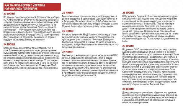 За прекращение перемирия На протяжении всего перемирия, длившегося неделю (ДНР и ЛНР присоединились к режиму прекращения огня 23 июня, а 27 июня были заключены договоренности продлить его еще на три дня), боевые действия не затихали. Украинские силовики и их противники не предпринимали значительных наступательных операций, но постоянно находились в огневом контакте с противником. По данным Совета национальной безопасности и обороны (СНБО), с момента прекращения огня были убиты 27 бойцов украинских силовых органов, число жертв среди мирного населения составляет не менее двух десятков.