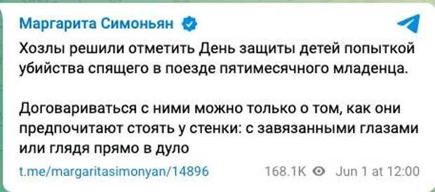 «Хозлы решили отметить День защиты детей попыткой убийства спящего в поезде младенца»: Симоньян отреагировала на ЧП под Брянском