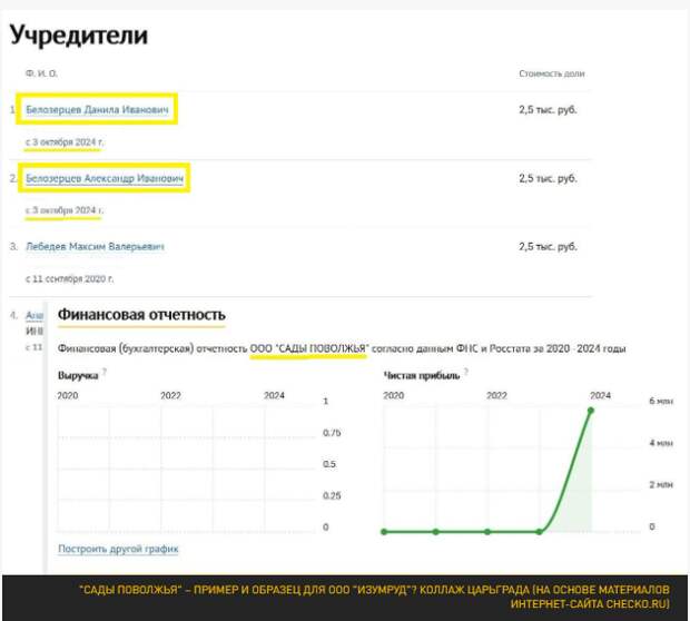 Любопытная история: фирма зарегистрирована в сентябре 2020 года и на протяжении четырёх лет не подавала признаков жизни. И только в 2024-м, когда в состав учредителей ООО были внесены Данила и Александр Белозерцевы, "Сады Поволжья" сразу показали отменный финансовый результат. Компания, в которой числится 1 работник, с полного нуля тут же показала прибыль в почти 6 млн рублей.