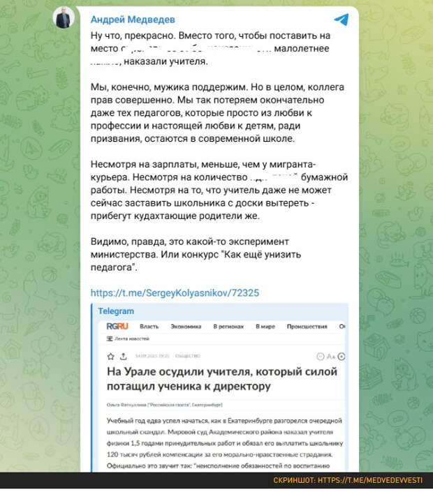 При этом, подчёркивают в местной прессе, восьмиклассник никакого наказания за своё поведение не понёс.Конечно, Фемида вынесла своё решение, наверняка опираясь в том числе на данные, которые от широкой публики остались скрыты (не будем забывать о закрытом режиме процесса). Но у той самой публики всё же возникли вопросы. Вот и Андрей Медведев возмутился - неудивительно, что учителя из школ бегут как от огня, поскольку не то что об их уважении речи давно не идёт, но и свои права отстоять невозможно.